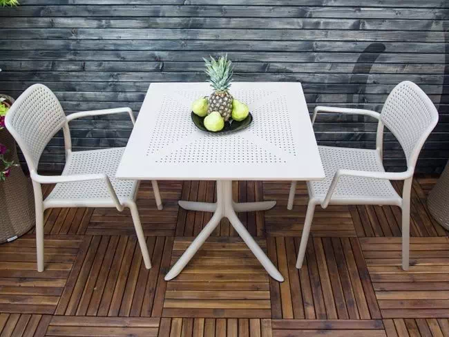 Современные комплекты из высококачественного пластика подойдут для уличных кафе, лаундж зон, террас и ресторанов. Они не боятся воды, высоких и низких температур. Имеется несколько моделей стульев с плетением под ротанг, различные цвета: белые, серые, черные и прозрачные.
