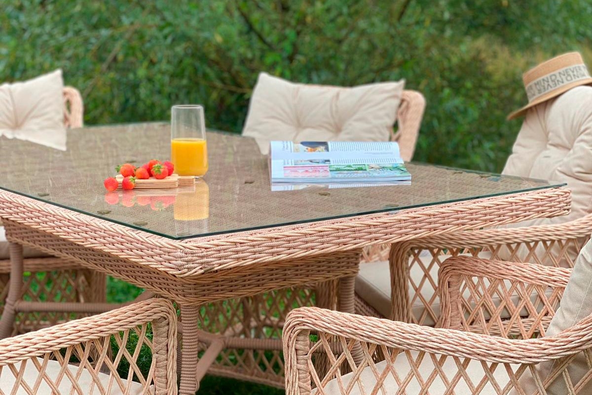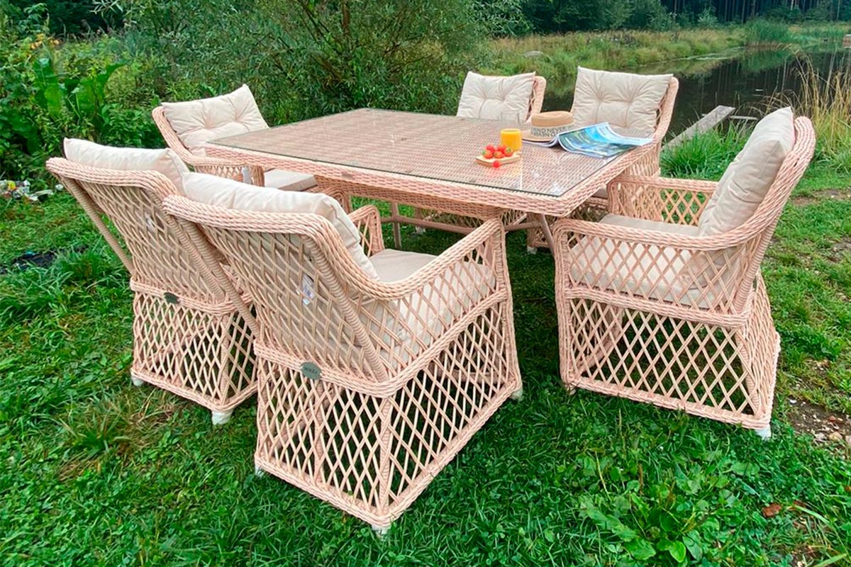 Легкое ажурное плетение в цвете персиковый пух, эргономичная форма спинки и подлокотников кресел и соломенный цвет мебели станут центром притяжения взгляда в любом интерьере или экстерьере.